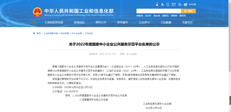 10月26日,國家工信部官網(wǎng)公示了2022年國家中小企業(yè)公共服…